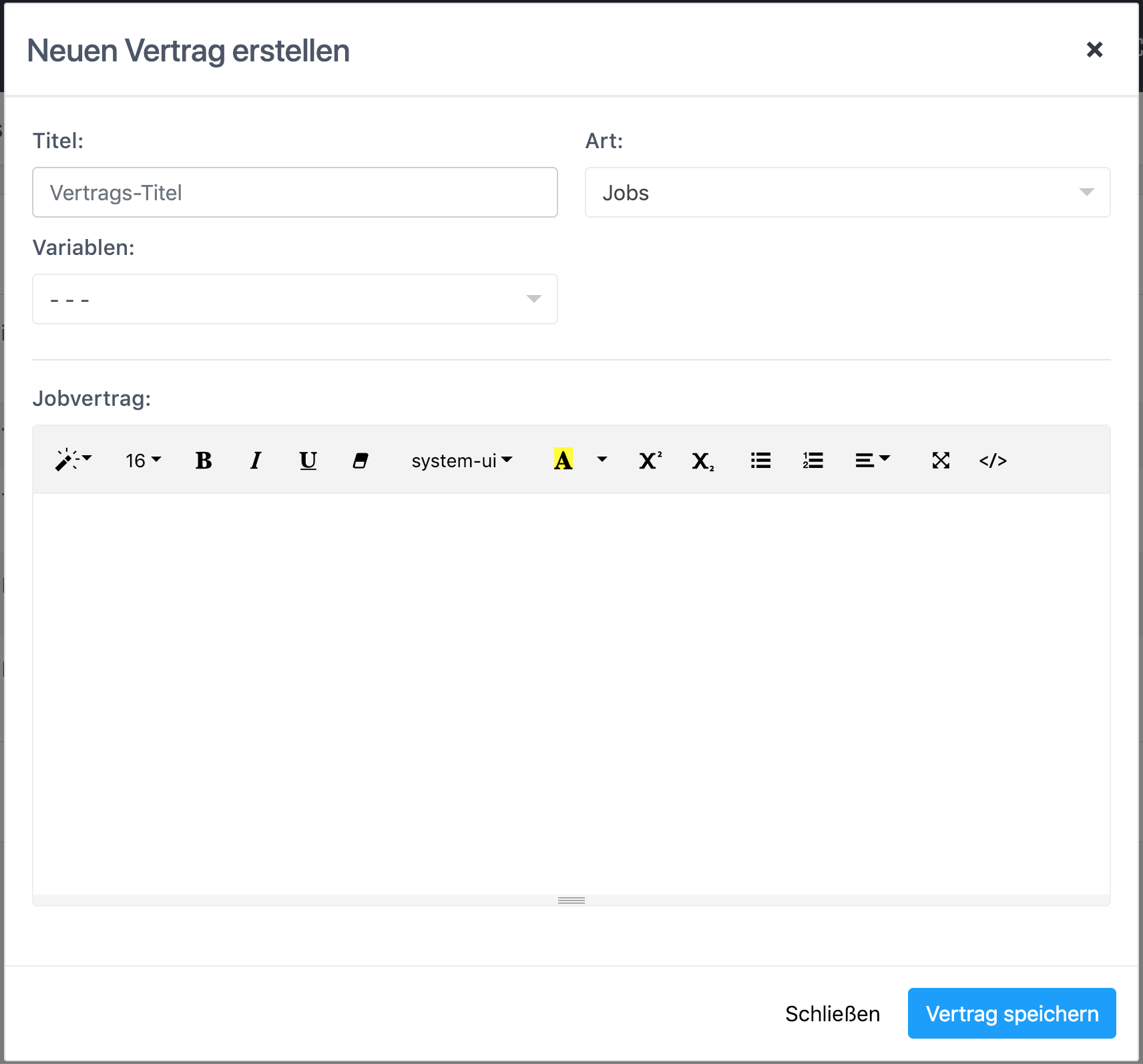 Um einen neuen Vertrag anzulegen, klickt man einfach auf den blauen Button " Neu". Es öffnet sich ein Fenster mit "Neuen Vertrag erstellen". Hier als erstes einen Titel vergeben, damit man den Vertrag später wieder zuordnen kann, anschließend die Art, also Jobs oder Hochzeit. Hat man sich für Jobs oder Hochzeit entschieden, erscheint ein Editorfenster und man kann auch schon loslegen und seinen Vertrag erstellen. Damit man nicht alle Kundendaten etc. eintragen muss, gibt es Variablen. Das sind Platzhalter, die durch die Kundendaten ersetzt werden (z.B. bei Jobs {{Kunde_Mobil}} - Hier wird die Handynummer vom Kunden automatisch eingetragen, sofern vorhanden). Die Variablen muss man aber nicht von Hand eintragen, sondern klickt in den Editor an die gewünschte Stelle und wählt dann die Variable aus. Die Variablen werden erst ersetzt, wenn man diesen Vertrag einem Job oder einer Hochzeit zuweist.