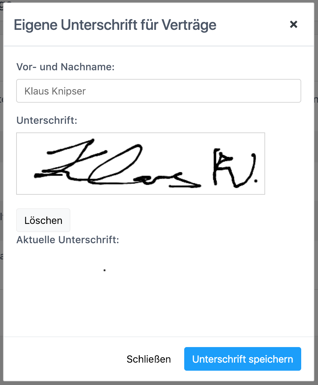 Damit auch die Funktion mit Verträgen einwandfrei funktioniert, muss man seine eigene Unterschrift im System hinterlegen. Hierzu einfach auf den blauen Button "Unterschrift" klicken und seinen Namen und Unterschrift eintragen.