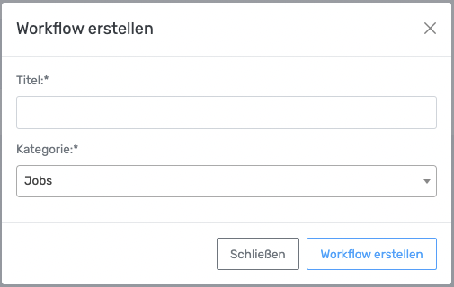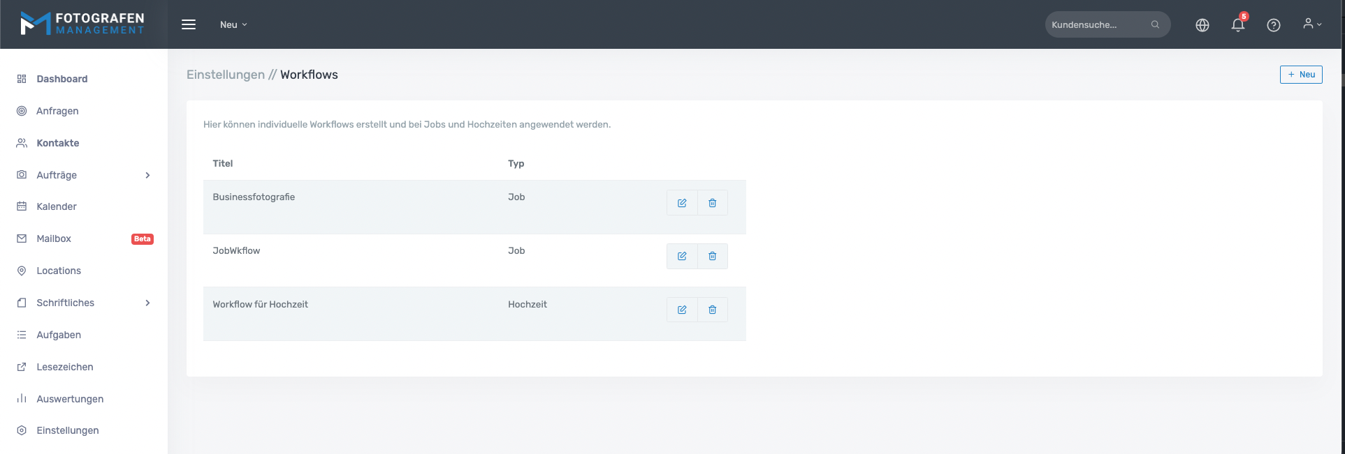 Um einen Workflow anzulegen, klickt man auf den blauen Button " Neuer Workflow". Es öffnet sich ein neues Fenster in dem man einen Workflow-Titel vergibt und auswählt, ob dieser für Jobs oder Hochzeiten gedacht ist. Anschließend auf den Button "Workflow erstellen" klicken. Der Workflow erscheint auf der linken Seite und auf der rechten Seite erscheint der Bereich für die Aufgaben. Hier können Aufgaben hinzugefügt, bearbeitet und gelöscht werden.