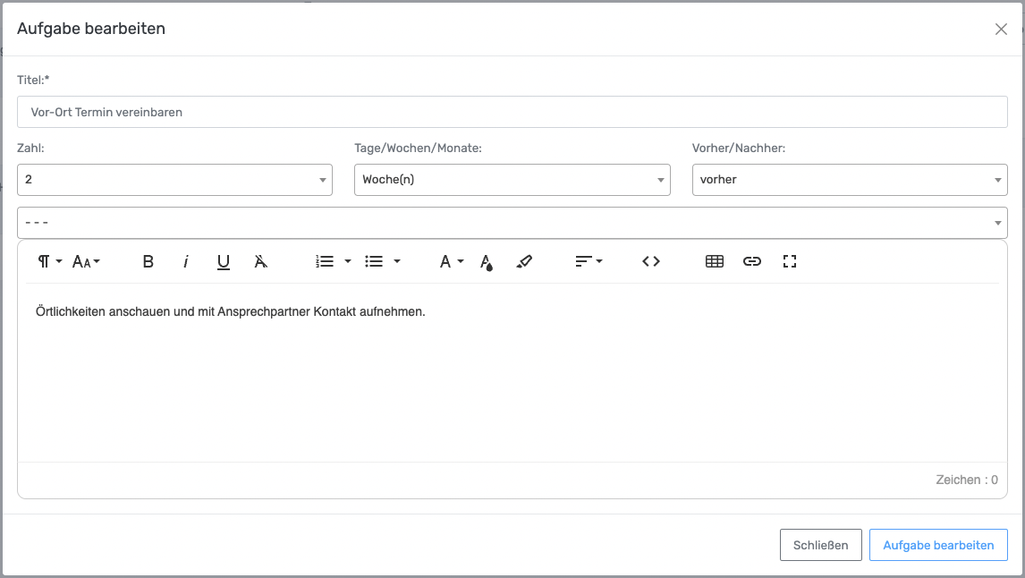 Möchte man eine Aufgabe 2 Wochen vor dem Job erstellen, gibt man bei Zahl eine 2 an, bei Tage/Wochen/Monate Woche(n) und bei Vorher/Nachher vorher an.