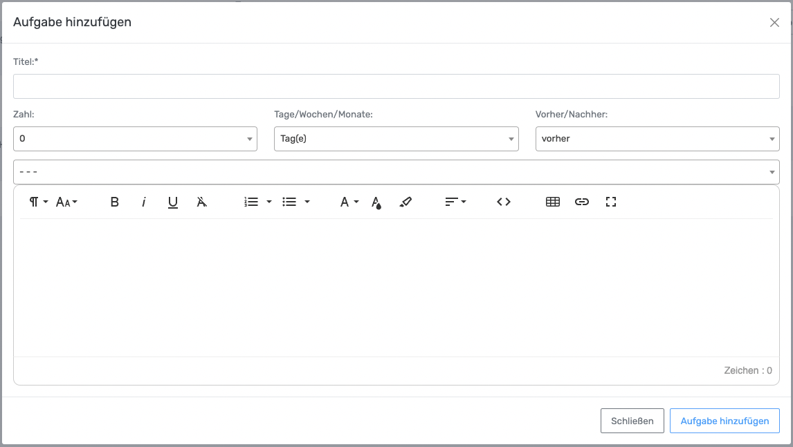 Möchte man nun eine Aufgabe zum Workflow hinzufügen, klickt man auf den grauen Button " Neue Aufgabe hinzufügen". Es öffnet sich ein neues Fenster. Hier kann der Aufgabentitel, sowie die Zeit, wann die Aufgabe fällig ist. Die Zeit ist immer relativ zum Job- oder Hochzeitsdatum.