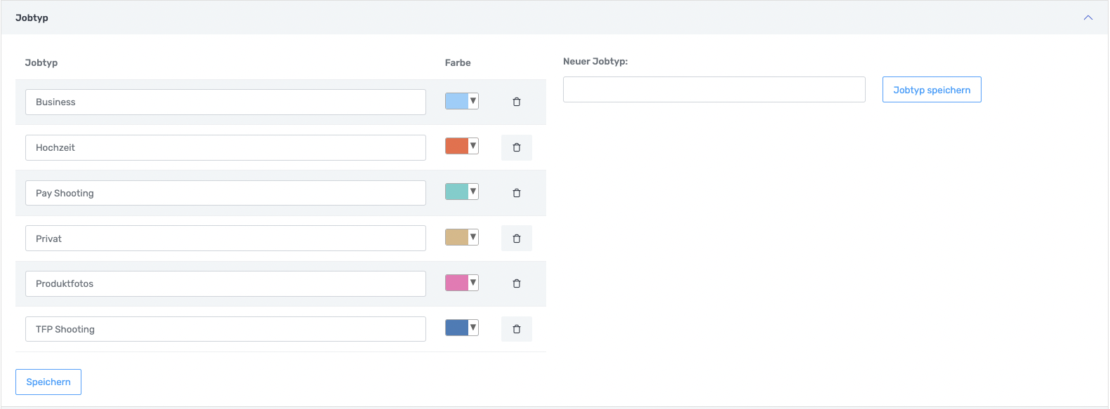 Jobs können kategorisiert werden und hierfür gibt es den Jobtyp. Zusätzlich kann eine Farbe ausgewählt werden. Diese ist dafür da, damit alle Jobs einer Kategorie immer die gleiche Farbe im Kalender bekommt. Das erhöht die Übersichtlichkeit im Kalender.