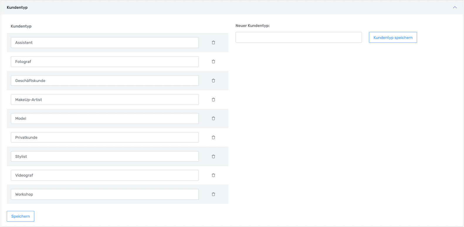 Es gibt die Möglichkeit Kontakte zwei Typen zuzuweisen, z.B. Privatkunde und Model. Diese Kundentypen können hier angepasst werden.