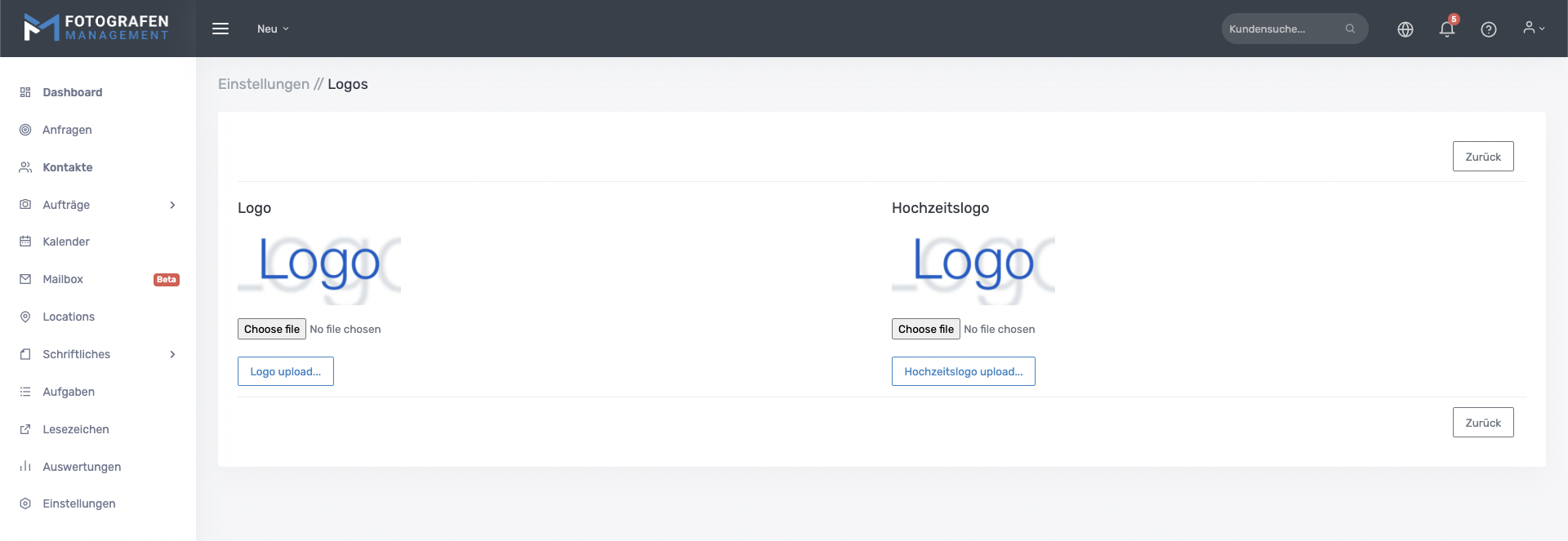In diesem Fenster kannst Du zum einen ein allgemeines Logo hochladen, welches u.a. auf Verträge und Briefpapier verwendet wird. Bietet man auch Hochzeiten an und hat hier ein eigenes Logo, kann man auch ein Hochzeitslogo hochladen und in Hochzeitsverträgen einbinden.