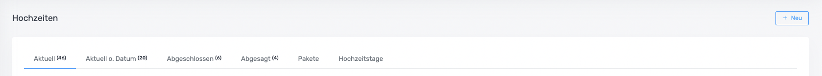 Unter Aufträge -> Hochzeiten hat man eine Übersicht über alle angelegten Hochzeiten.