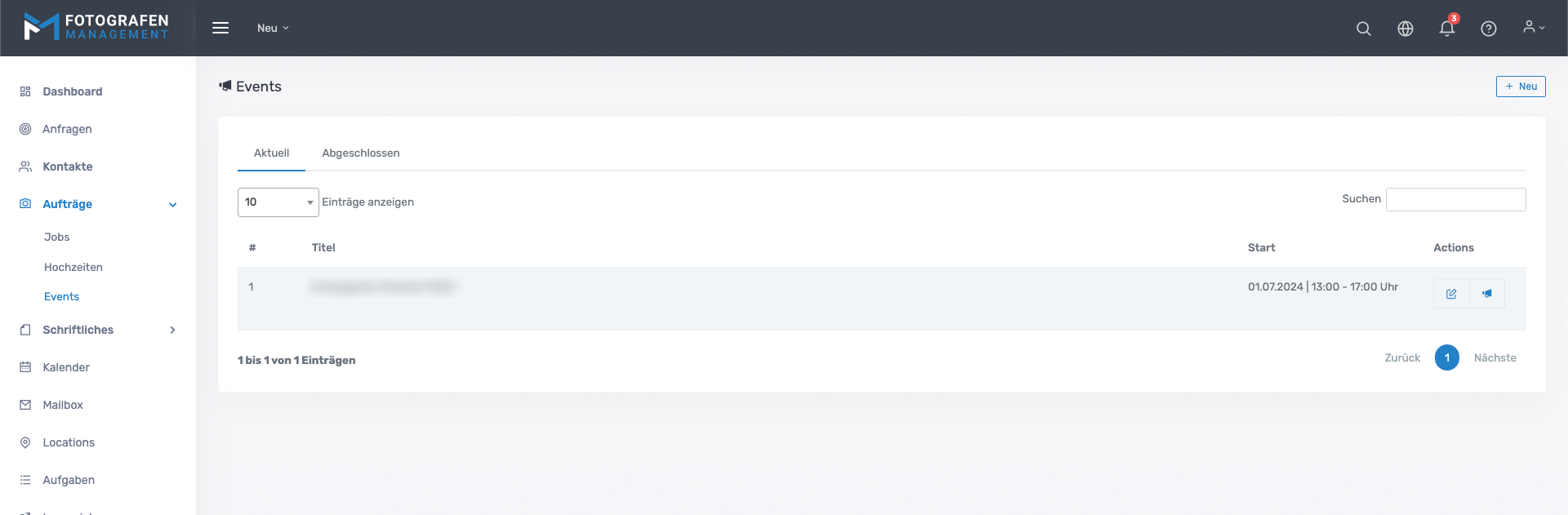 Durch klick auf den Button Neu hat man die Möglichkeit, ein neues Event zu erstellen.