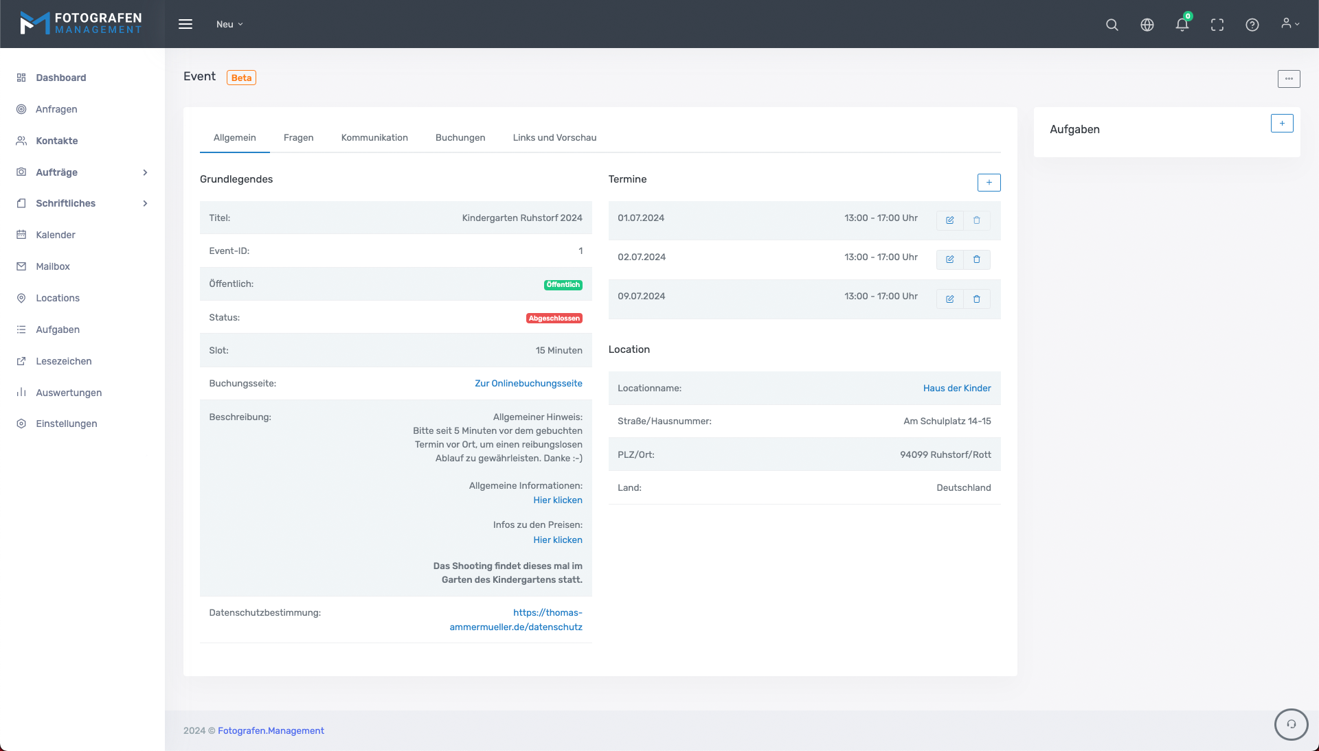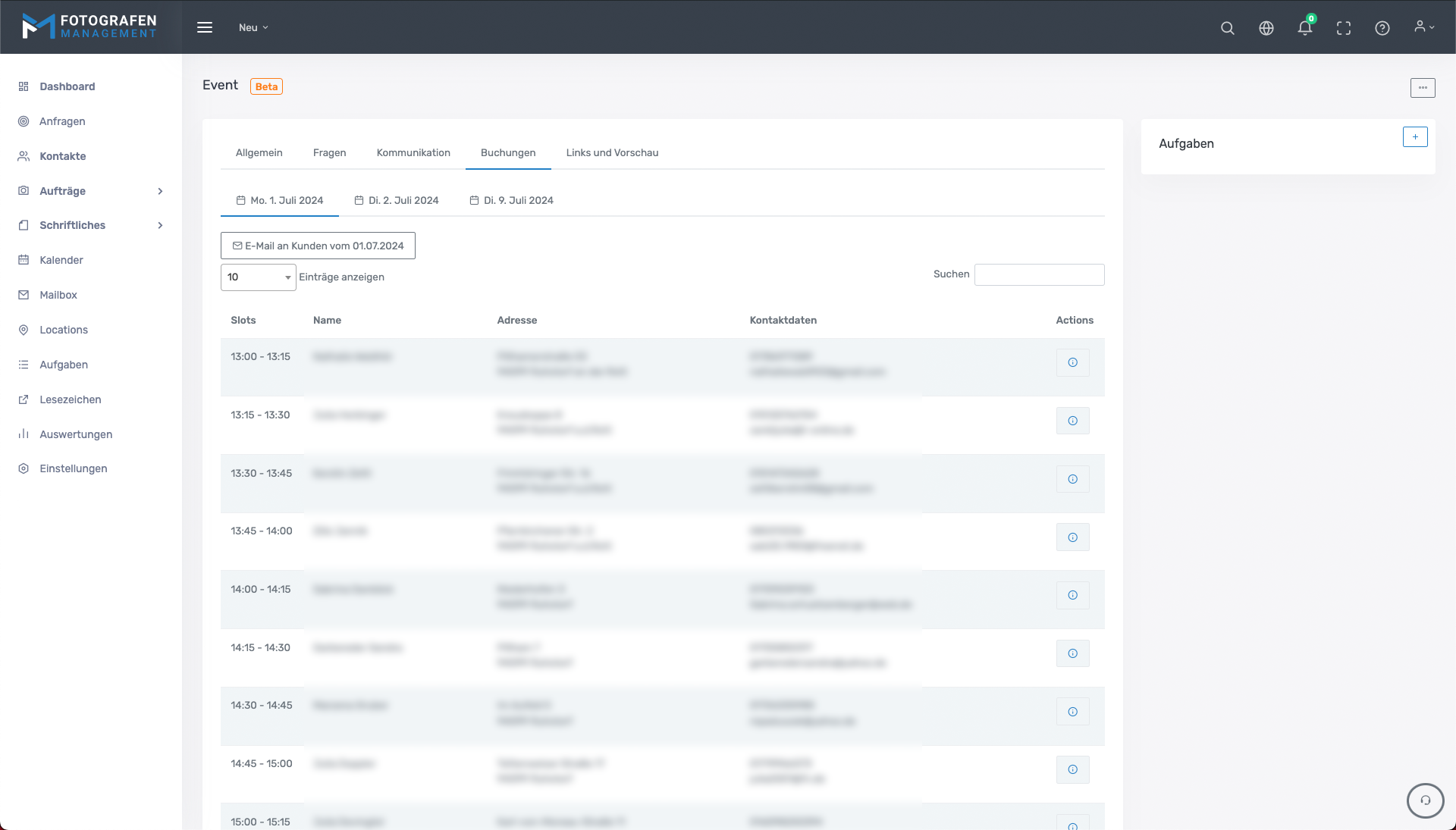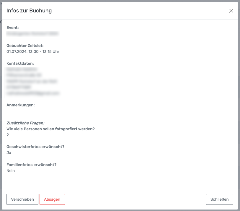 Hier sieht man auf der rechten Seite alle Informationen zum gebuchten Slot inkl. aller Eingaben. Zusätzlich erhält der Fotograf, sowie der Kunde eine E-Mail mit einer Buchungsbestätigung und falls in den Einstellungen -> Voreinstellungen eingestellt, wird auch die Buchung im Kalender eingetragen.