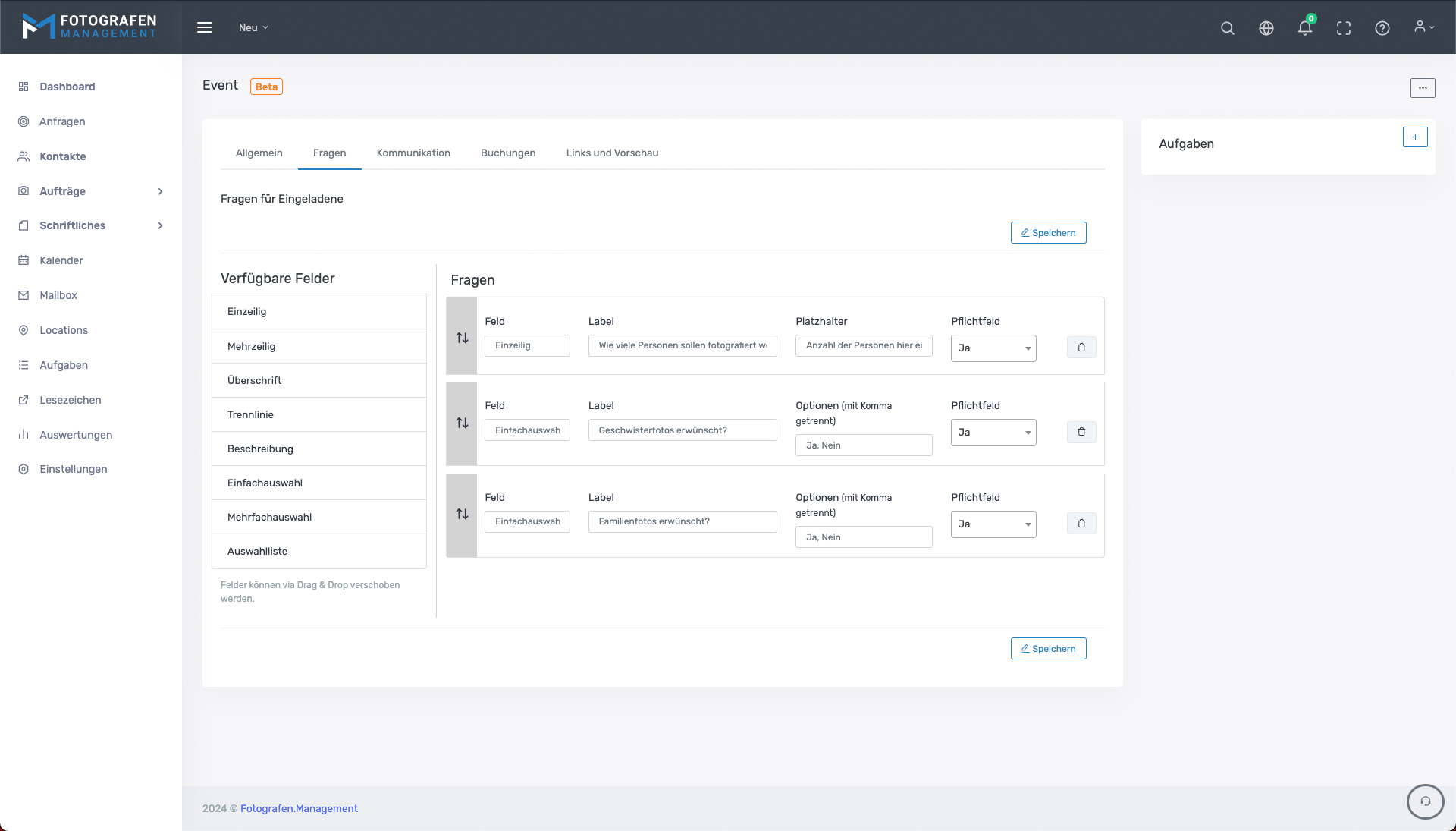 Unter Fragen können wie bei Kontaktformularen und Fragebögen Formularfelder via Drag&Drop eingefügt werden und angepasst. So hat man die Möglichkeit, Informationen von den Kunden einzufordern, um besser auf den Kunden vorbereitet zu sein. Anschließend einfach auf Speichern klicken.
