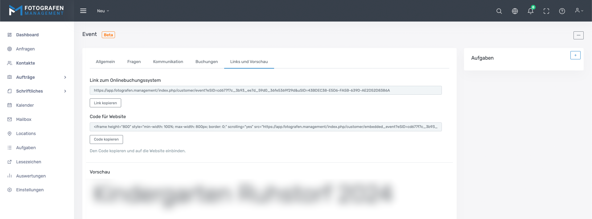 Im Reiter Links und Vorschau hat man zum einen die Möglichkeit, den Link zum Onlinebuchungssystem für dieses Event zu kopieren und dieses in einen Newsletter, WhatsApp - Gruppe, oder ähnliches zu teilen, aber man kann sich auch den Code kopieren für die Website. Damit kann man wie Formulare das Onlinebuchungssystem auf die eigenen Website einzubinden.