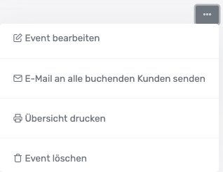 - Event löschen: Durch klick auf Event löschen, wird das Event selbst, aber auch die hinzugefügten Zeitslots, die Fragen, sowie deren Beantwortung der Kunden, die Buchungen selbst, aber auch die Einträge im Kalender gelöscht.