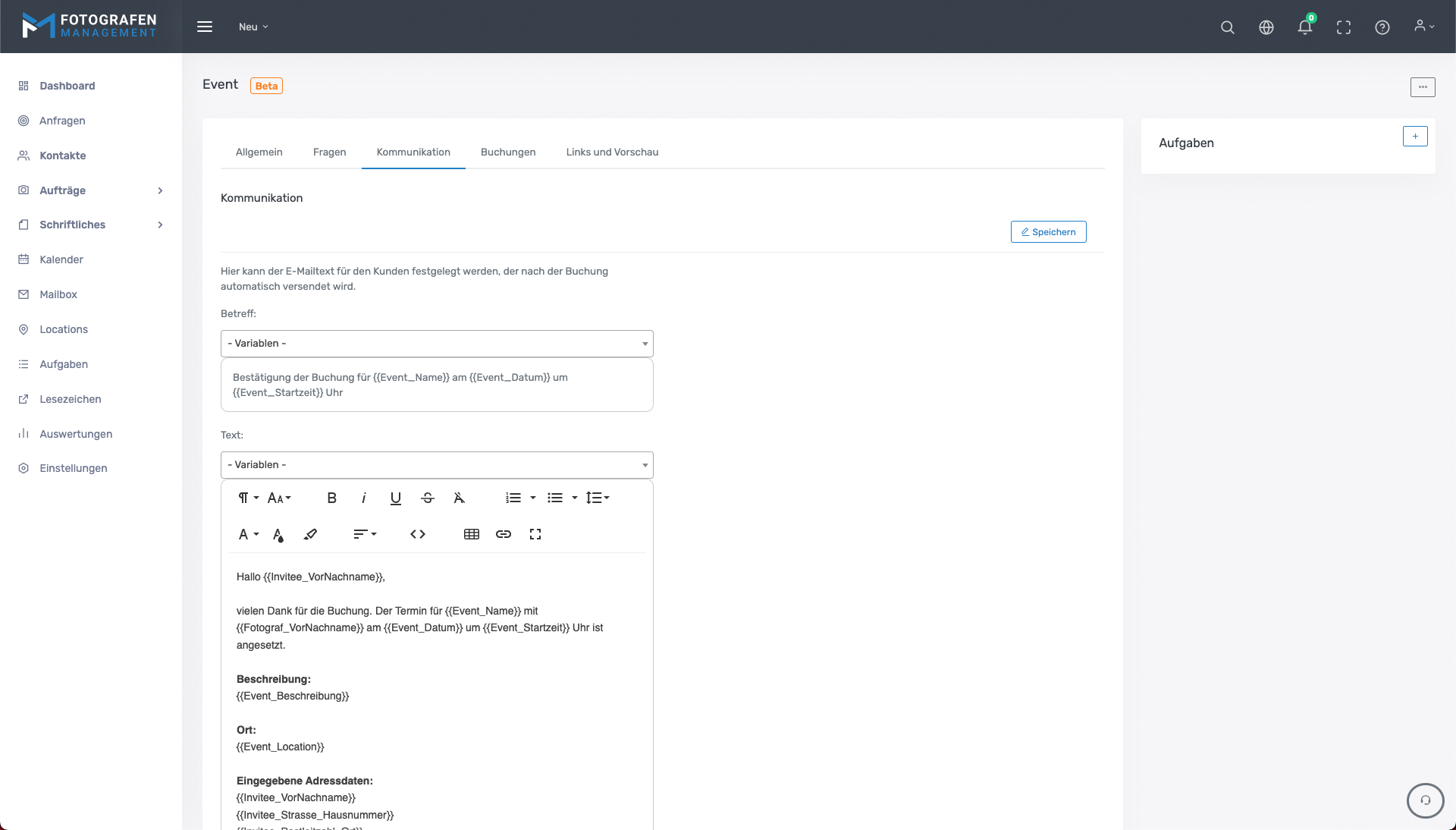 Hier kann der Betreff sowie der E-Mailtext festgelegt werden und es gibt hier auch neue Variablen für den Kunden, der gerade gebucht hat. {{Invitee}}