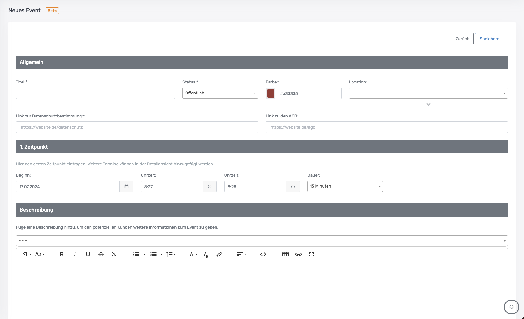 - Location: Hier kann eine bereits angelegte Location ausgewählt oder eine neue angelegt werden. Die Location wird auch auf der Buchungsseite angezeigt.