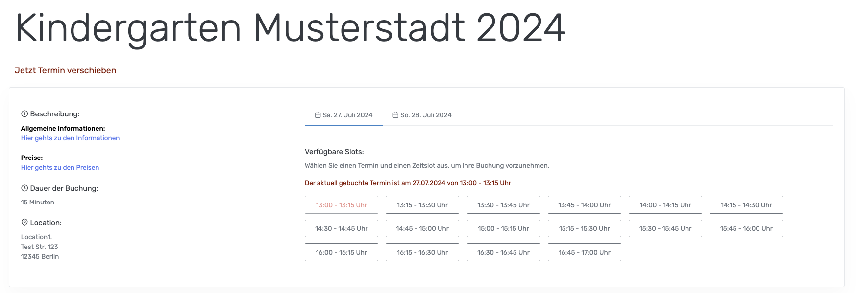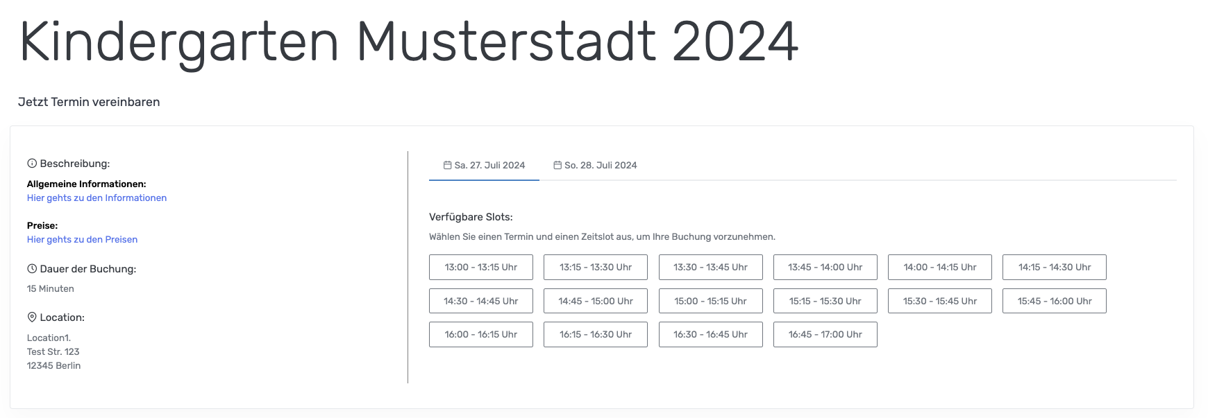 - Rechte Seite: Hier werden die einzelnen Tage in Reiter angezeigt und darunter die verfügbaren Slots