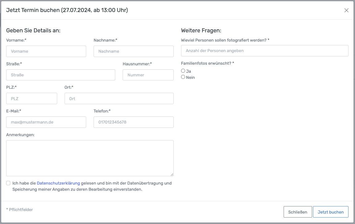 Möchte ein Kunde buchen, klickt er auf den gewünschten Zeitslot und anschließend öffnet sich ein Fenster:
