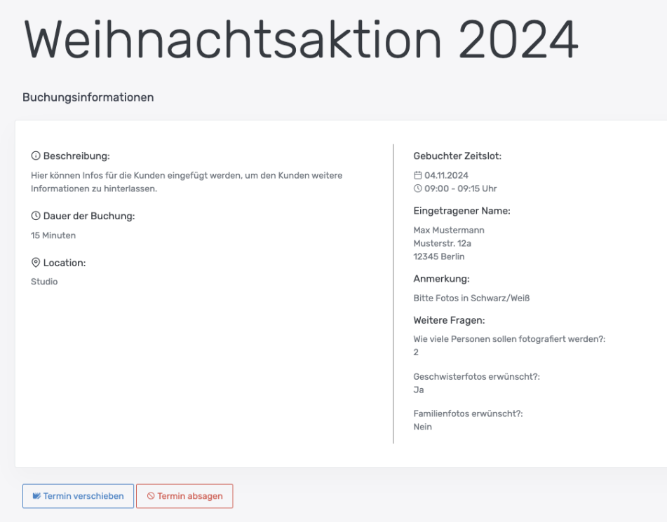 Zusätzlich hat man als Fotograf die Möglichkeit, den Termin für den Kunden zu verschieben oder abzusagen, falls dieser einen z.B. anruft, weil er es selbst nicht machen kann.