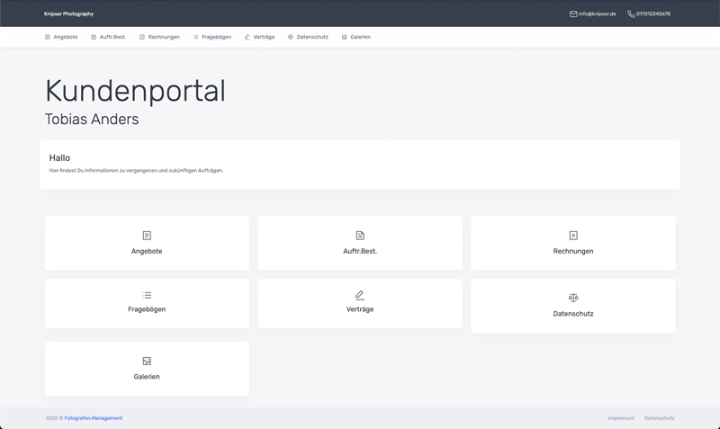 Gelangt der Kunde auf die Hauptseite des Kundenportals, sieht er diese Übersicht.