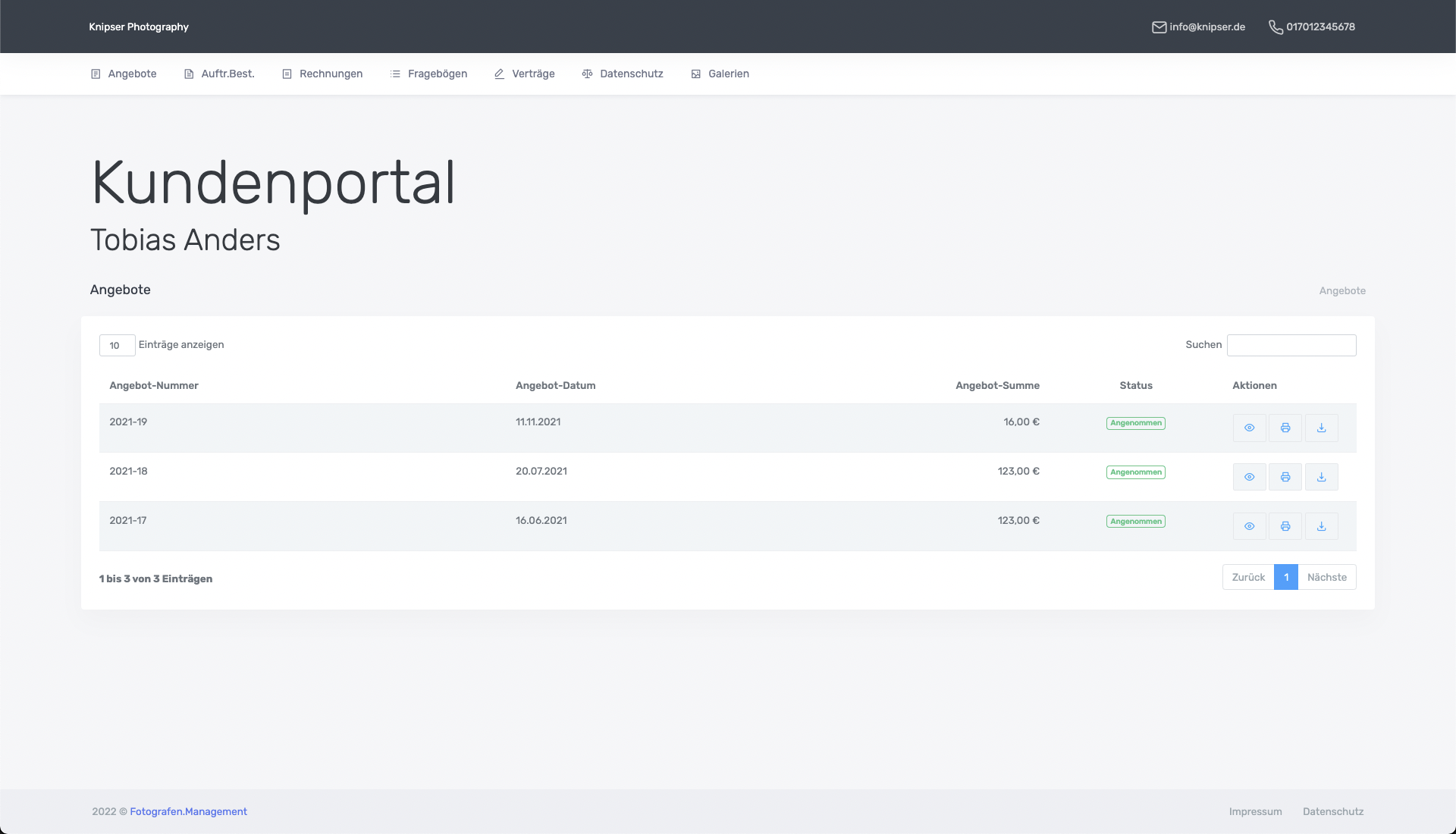 Hier sieht man zum einen die Angebotsnummer, das Angebotsdatum, die Summe, den Status (ob angenommen, abgelehnt oder noch offen) und Aktionsbutton zum Einsehen, Drucken und Herunterladen.