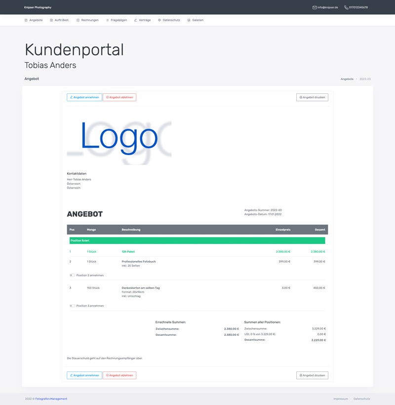- Angebot drucken: Hier kann der Kunde das Angebot ausdrucken.
