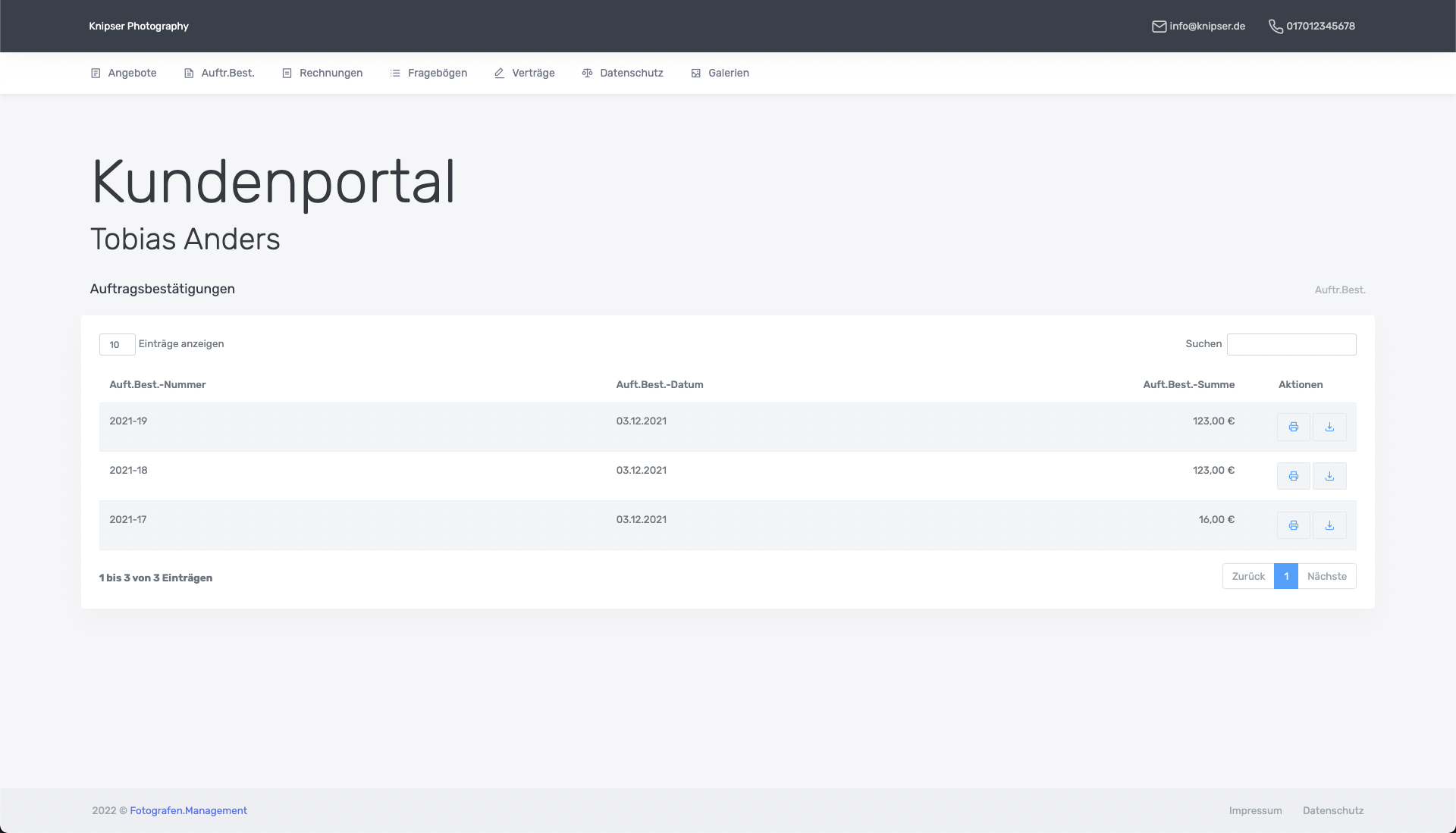 Hier sieht der Kunde alle vorhandenen Auftragsbestätigungen und kann diese drucken oder herunterladen.