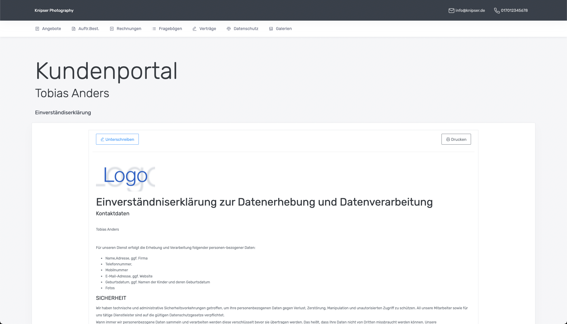 Unter dem Punkt Datenschutz befindet sich die Einverständniserklärung. Diese müsste vom Kunden unterschrieben werden, damit man seine Daten verarbeiten darf.