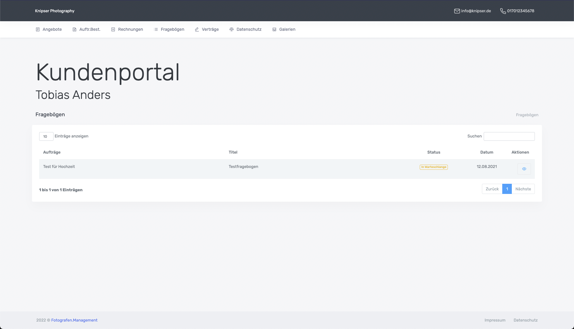 Hier werden dem Kunden alle Fragebögen aufgelistet, welche über Jobs und Hochzeiten zugewiesen wurden.