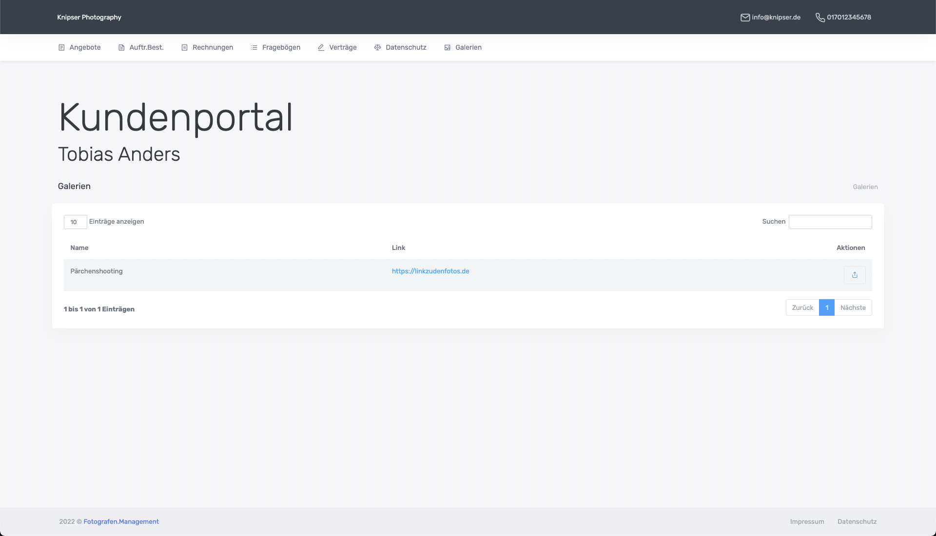 Unter Galerien werden alle bei Jobs, Hochzeiten und der Kontaktdetailansicht erstellten Links zu Galerien aufgelistet.