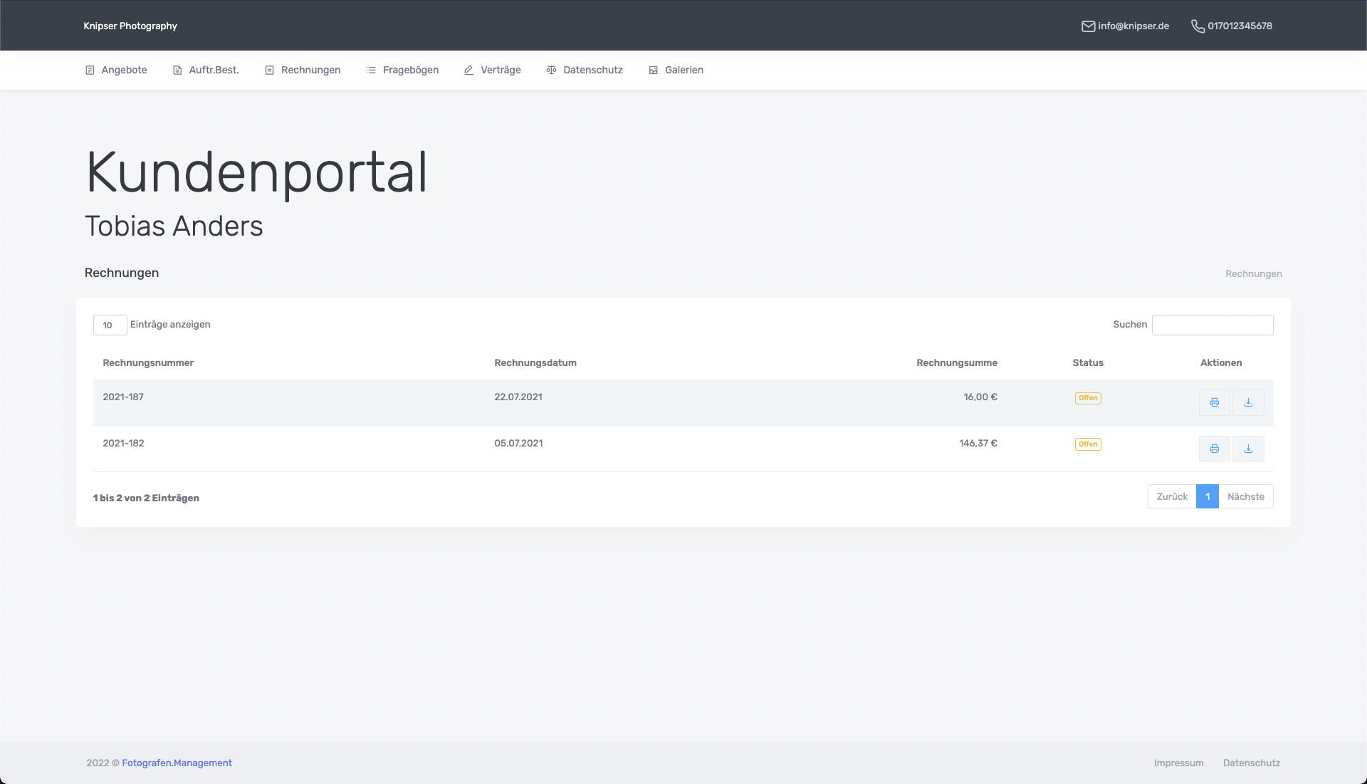 Hier werden dem Kunden alle existierenden Rechnungen aufgelistet, man sieht u.a. den Status, ob die Rechnung bezahlt ist er hat die Möglichkeit sich die Rechnungen auszudrucken und herunterzuladen.