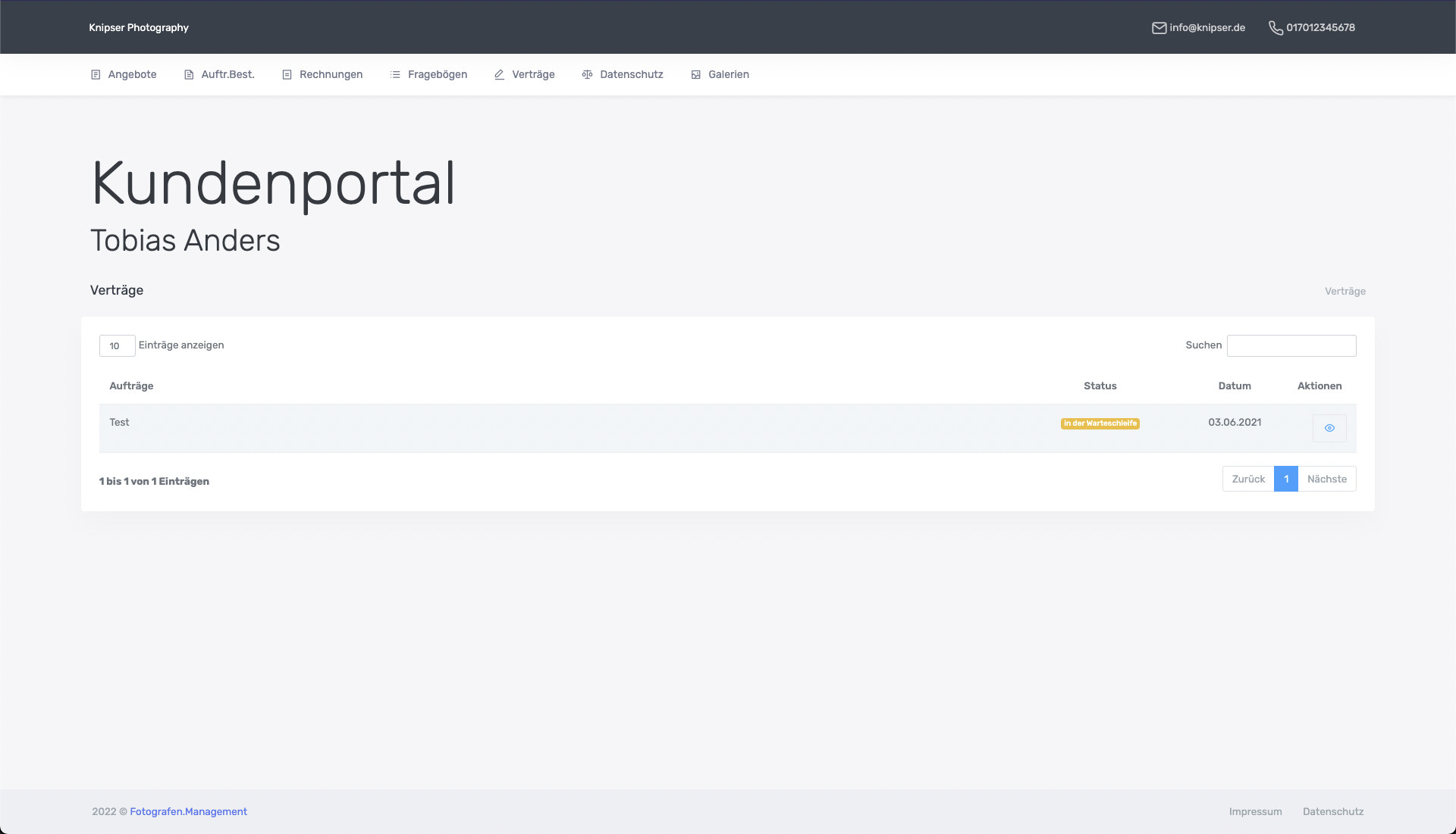 Mit dem Augensymbol unter Aktionen gelangt man zum Vertrag und kann vom Kunden unterschrieben werden. Unterschreibt der Kunde den Vertrag, erhalten der Kunde und der Nutzer von Fotografen.Management jeweils eine E-Mail mit dem unterschrieben Vertrag als PDF und zusätzlich wird der Status des der Hochzeit auf Vertrag unterschrieben gesetzt und in der Liste der Verträge bei den Aufträgen sieht man ebenfalls, dass der Vertrag unterschrieben wurde.