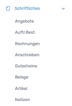Im Bereich Schriftliches hat man die Möglichkeit, Angebote, Auftragsbestätigungen, Rechnungen, Anschreiben, Gutscheine, Belege, Artikel und Notizen zu erstellen.