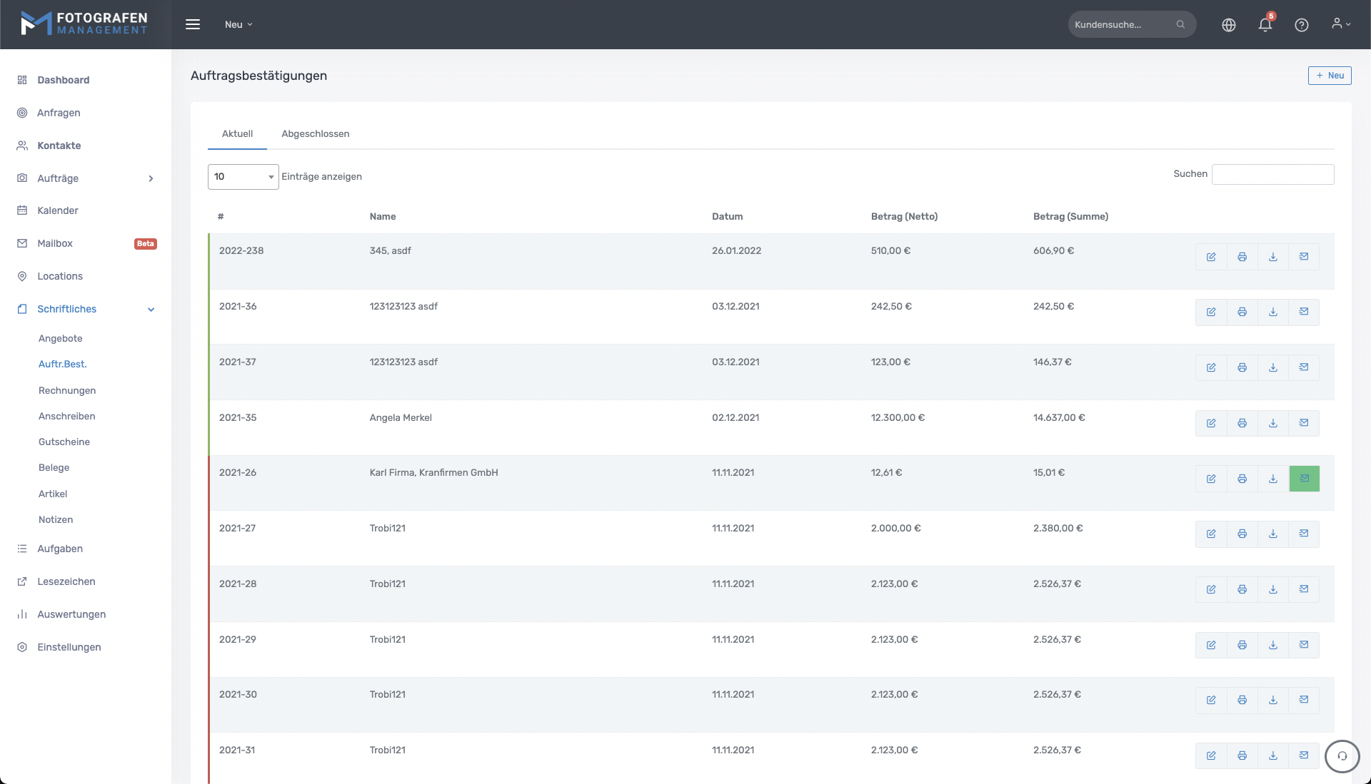 Im Bereich Auftragsbestätigung hat man eine Auflistung aller aktuellen Auftragsbestätigungen und abgeschlossener