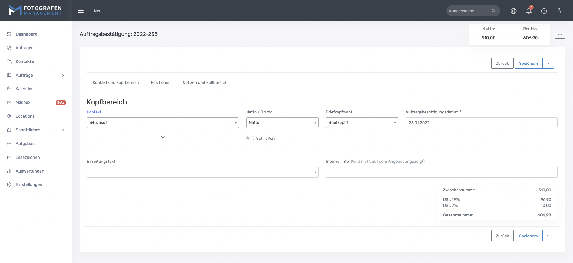 - Im Bereich Kontakt und Kopfbereich kann der Kunde ausgewählt oder neu angelegt werden.