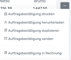 - Auftragsbestätigung duplizieren: Hier wird die Auftragsbestätigung dupliziert mit allen Inhalten der aktuellen Auftragsbestätigung.