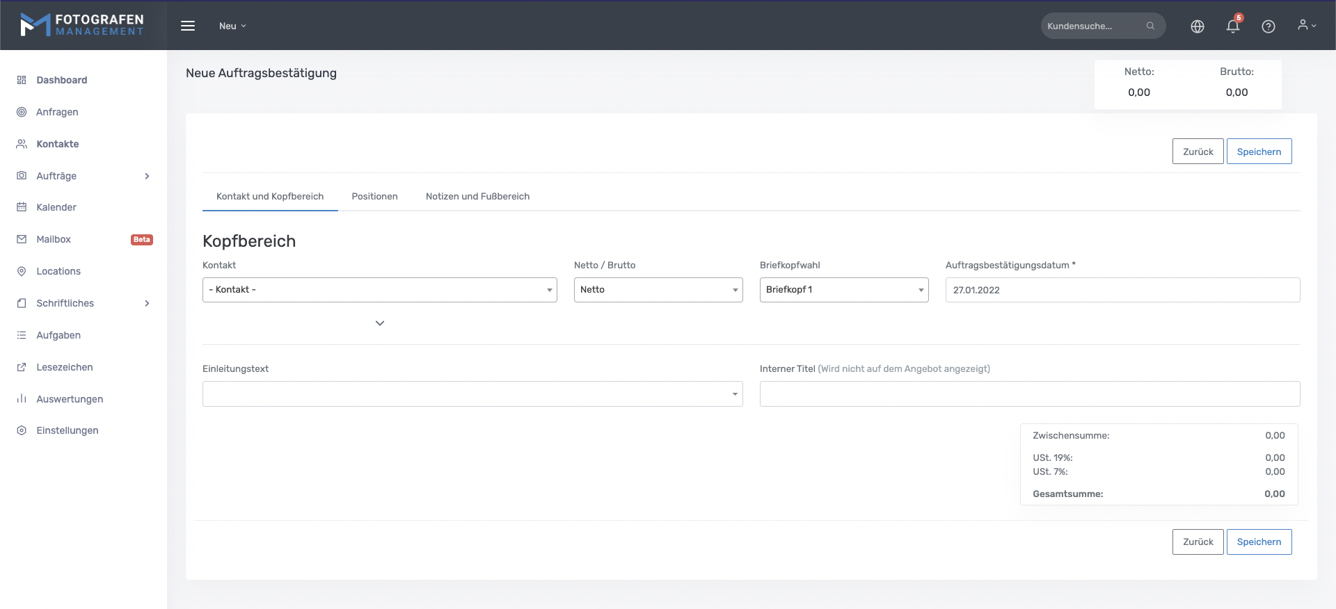 - Auftragsdatum wird automatisch auf den aktuellen Tag gesetzt.