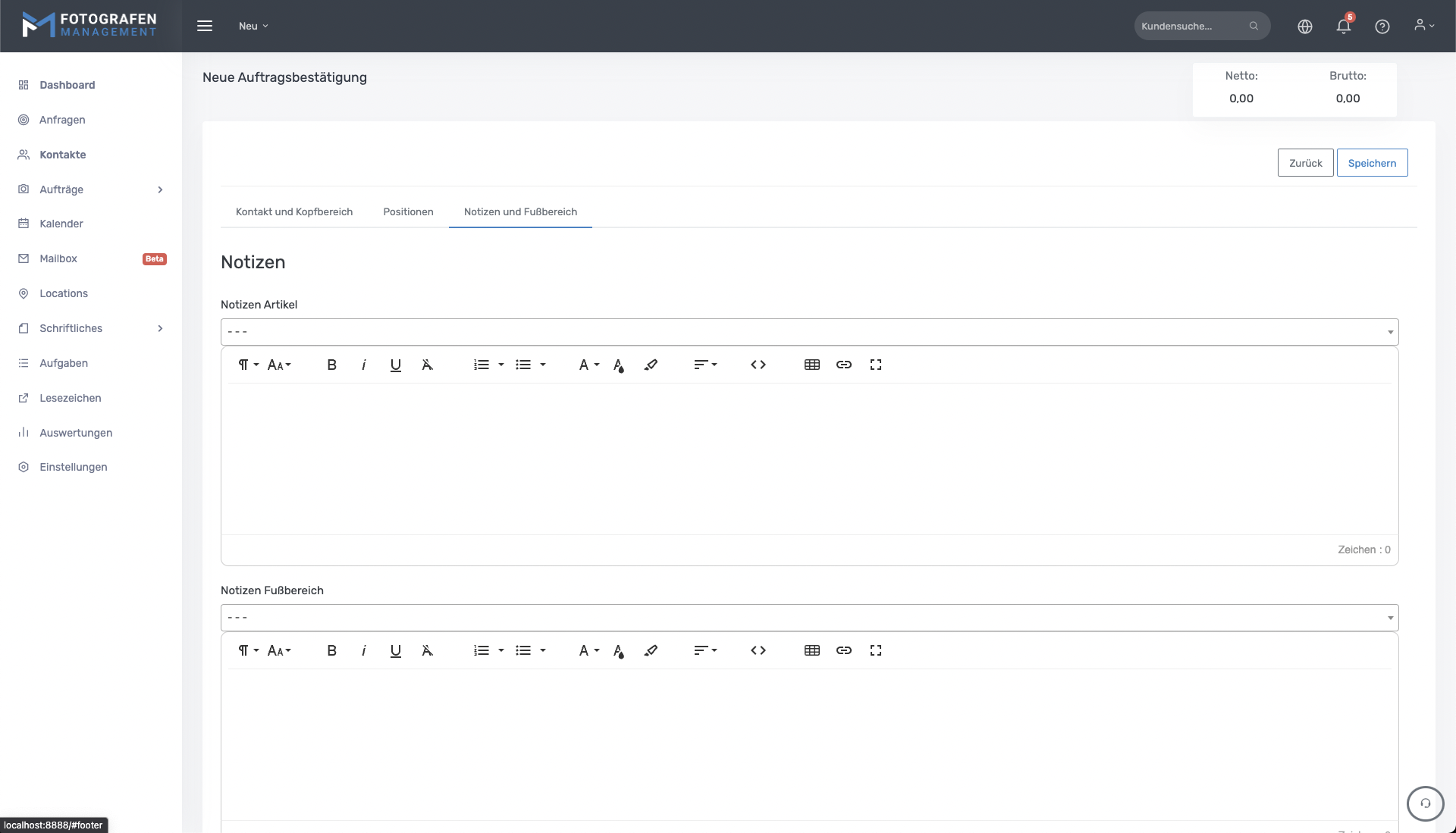 Auftragsbestätigung angezeigt werden, ausgewählt oder eingetragen werden. Über den beiden Feldern Notizen, können Notizvorlagen ausgewählt werden, welche unter Einstellungen -> Notizvorlagen angegeben werden können.
