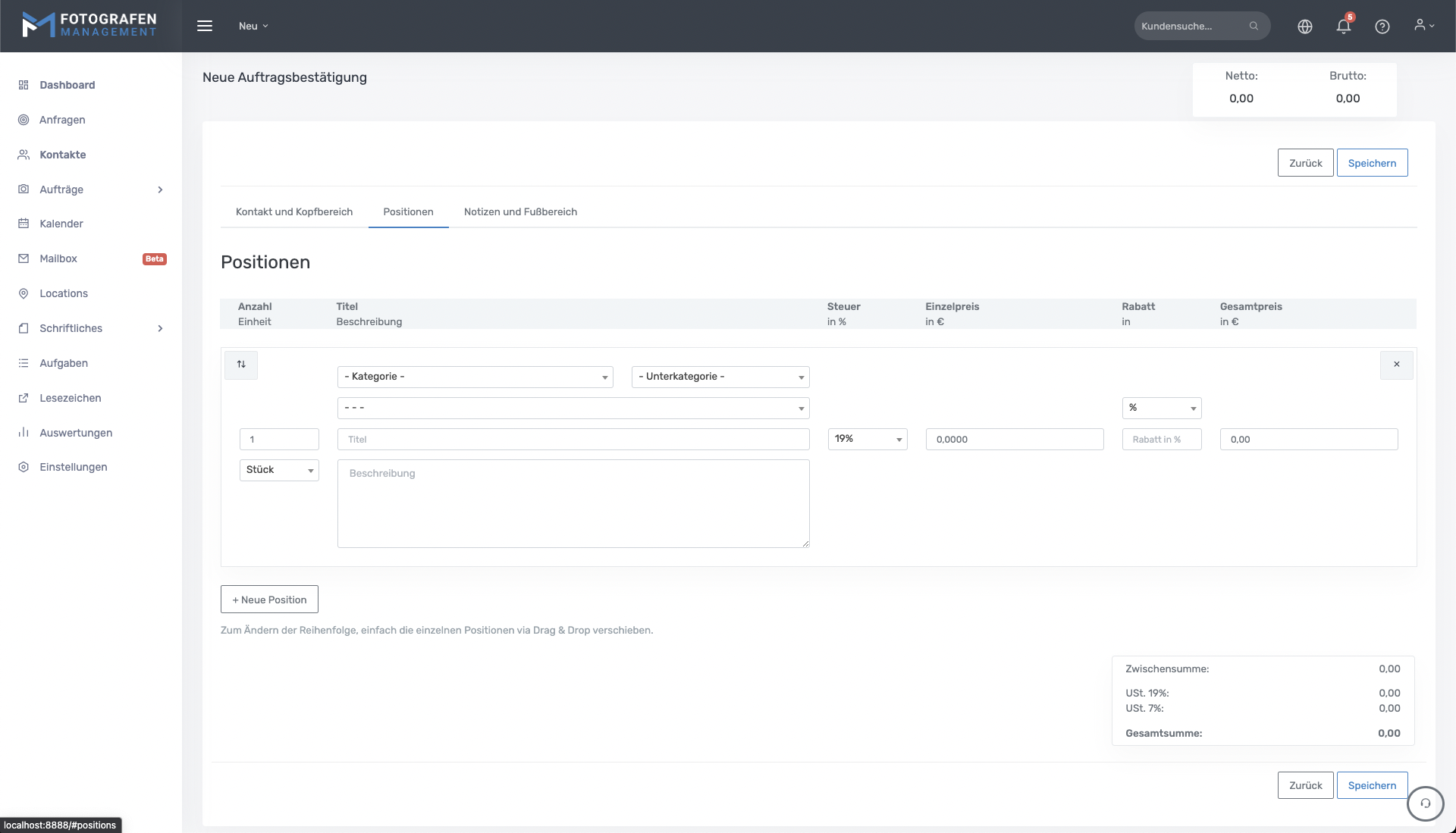 Mit dem Button Neue Position können neue Positionen hinzugefügt werden, mit dem X hinter der Position kann diese gelöscht werden und mit den Pfeilen links oben bei jeder Position, kann diese per Drag and Drop verschoben werden.