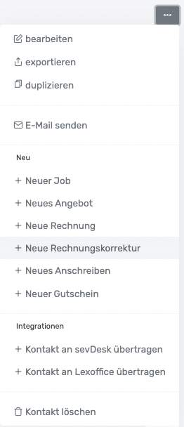 Muss eine Rechnung korrigiert werden, kann diese über die Kontakt Detailseite über das Aktionsmenü oben rechts unter Neue Rechnungskorrektur erstellt werden.