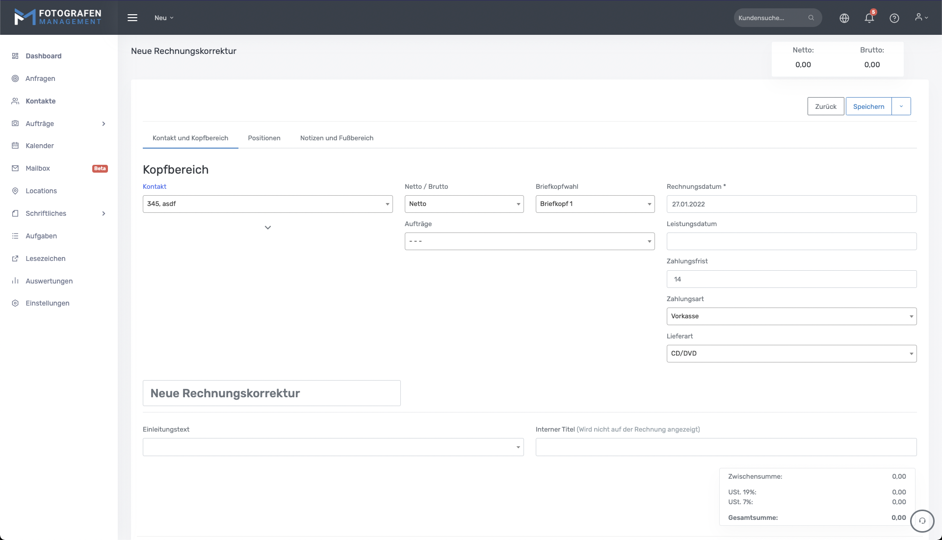 Man wird auf die Rechnungsseite weitergeleitet und es wird der Kontakt übernommen, sowie im Titelbereich Neue Rechnungskorrektur eingetragen.