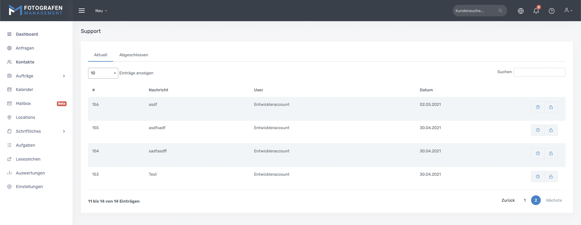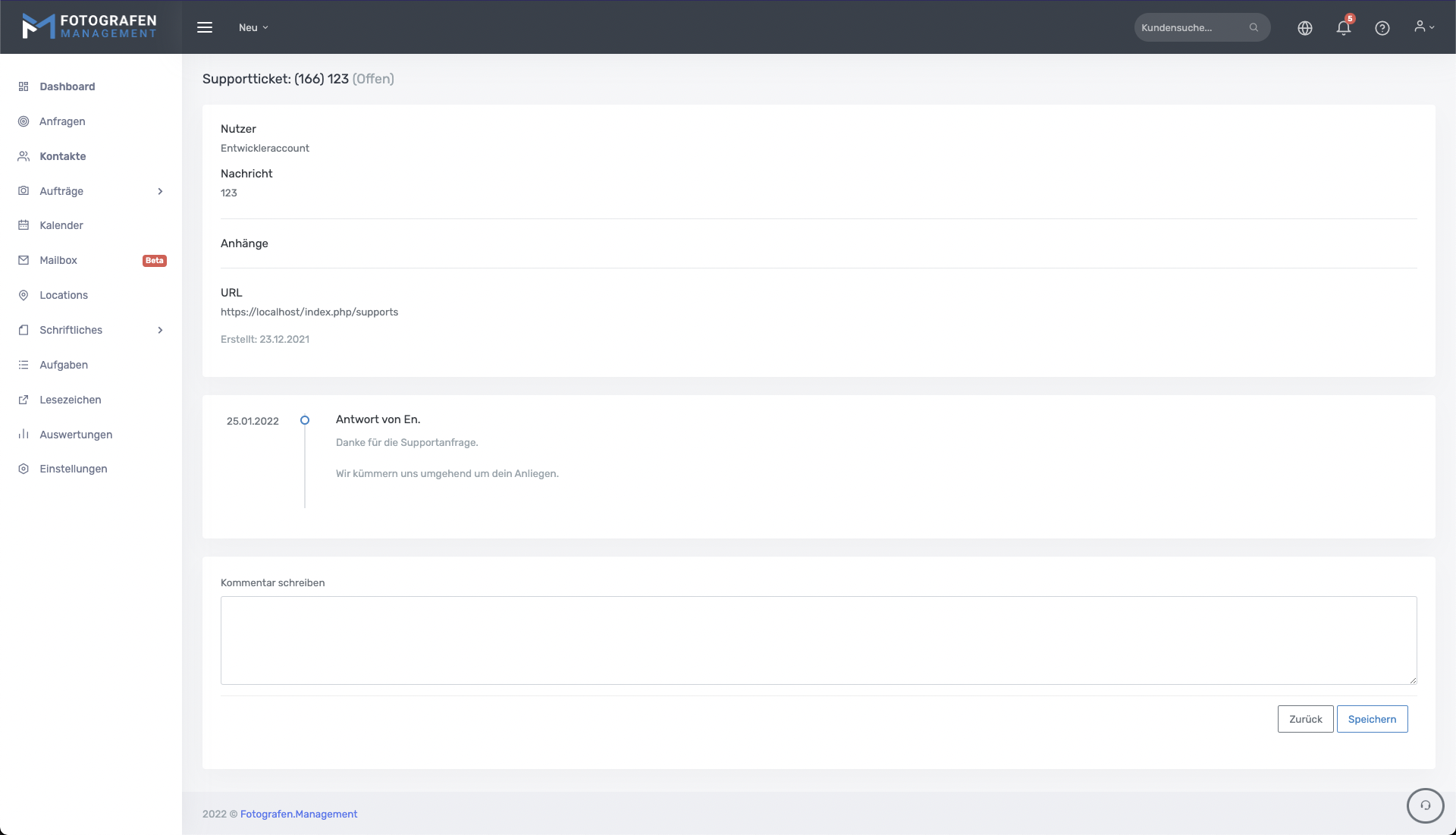Hat der Nutzer von Fotografen.Management Fragen oder Probleme, hat er mit der Supportfunktion, ein Ticket bei uns einzureichen.