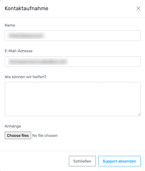 Der Name und die E-Mailadresse wird automatisch eingetragen, somit muss nur der Supporttext eingetragen werden und man hat die Möglichkeit Anhänge hinzuzufügen, wie z.B. Screenshots von der jeweiligen Seite.